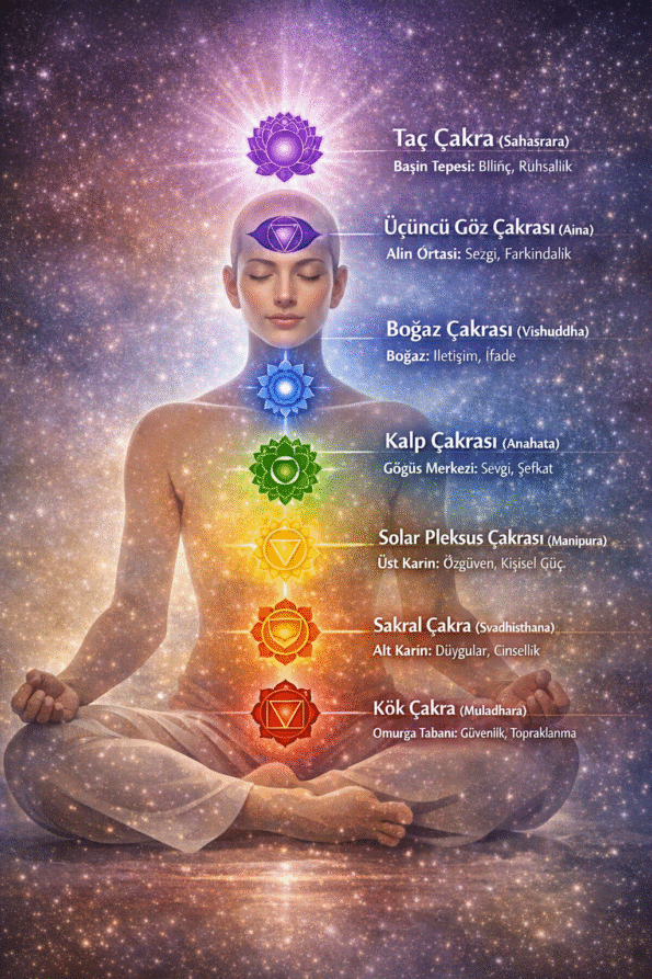 Çakralar ve Özellikleri Aşağıdaki Gibidir Genel kabul gören spiritüel ve yogik öğretilere göre insan bedeninde 7 ana çakra bulunur. 1- Kök Çakra — Muladhara Konum: Kuyruk sokumu / omurganın tabanı Renk: Kırmızı Element: Toprak Temalar: Güvenlik, hayatta kalma, fiziksel ihtiyaçlar, aidiyet Fiziksel ilişkiler: Bacaklar, ayaklar, kemikler, kalın bağırsak Dengede ise: Güvende hissetme, istikrar, dayanıklılık Dengesiz […]
