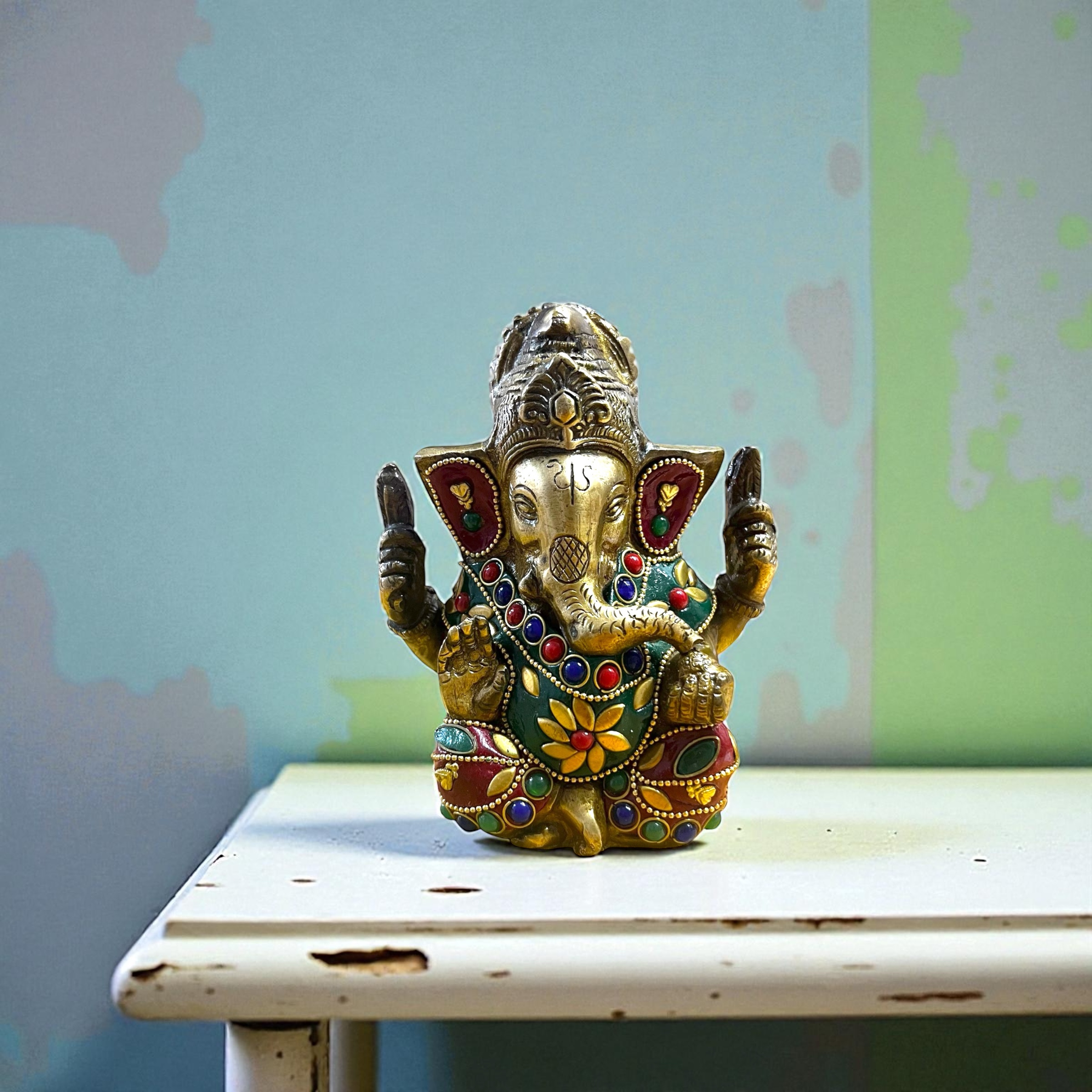 Ganesha Heykeli Pirinç Alaşım & Taş Bezeli 12cm